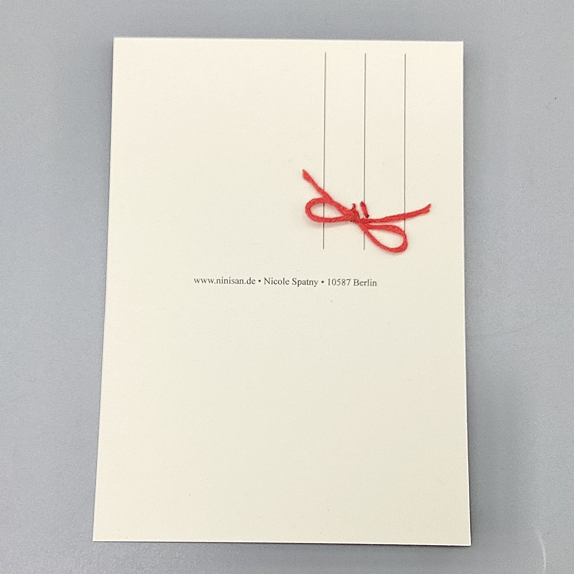 Die nini san Zeichnung wird von mir anfangs mit einem Bleistift auf Papier gemalt, danach zeichne ich die Skizze mit einem Schwarzstift nach und male sie mit Buntstiften aus. Anschliessend schicke ich die fertige Karte zu meiner Druckerei. Das Bild wird dort eingescannt und in kleinen Auflagen für mich hergestellt.