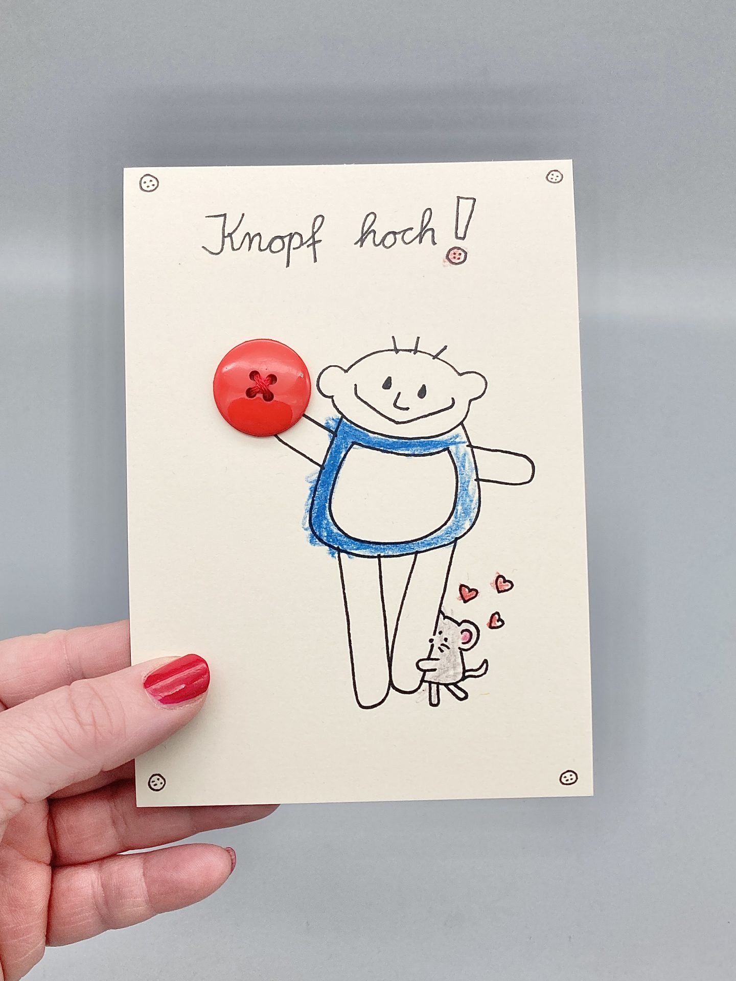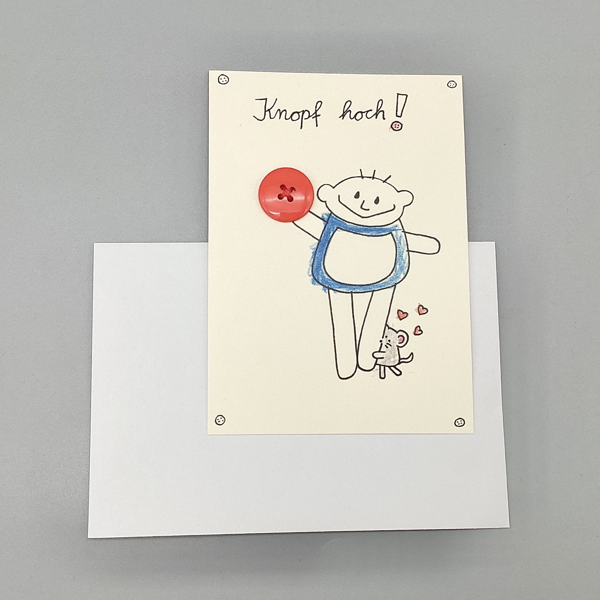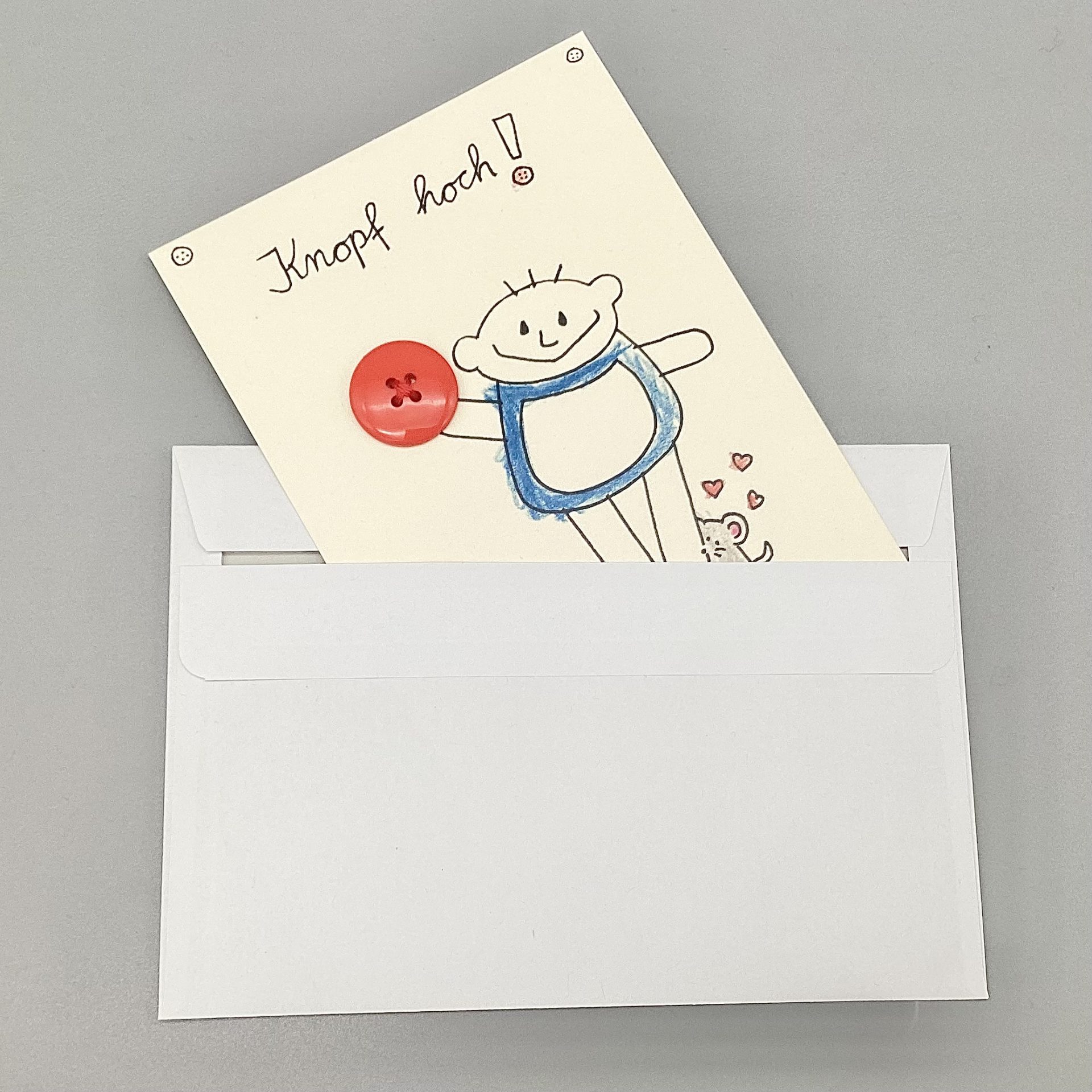 Mutmachkarte Knopf hoch ! mit rotem Knopf und weißen Umschlag