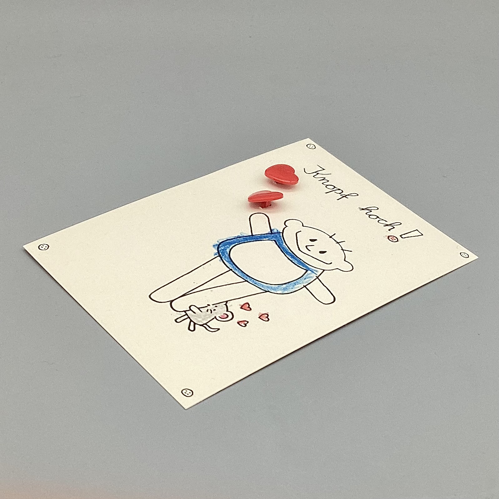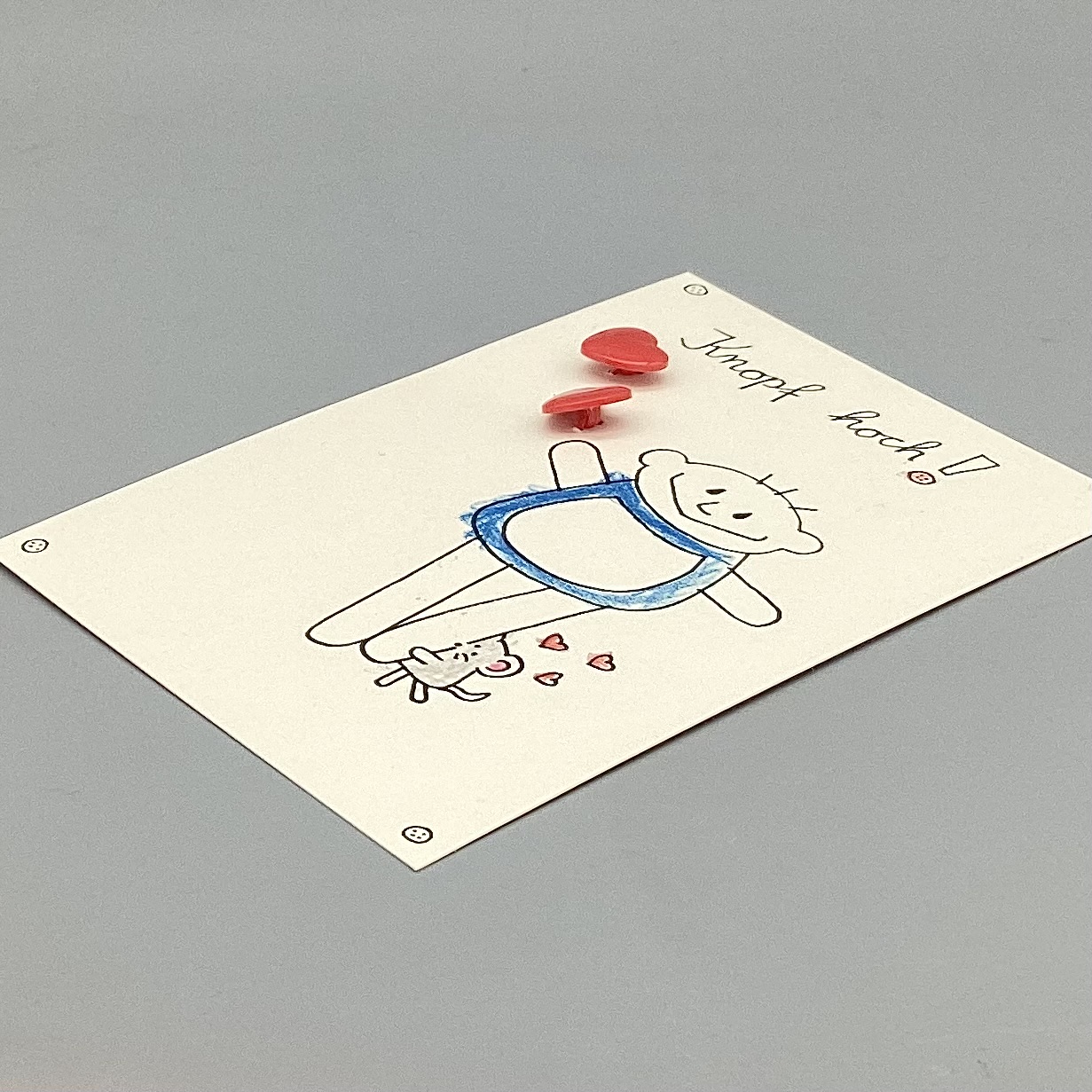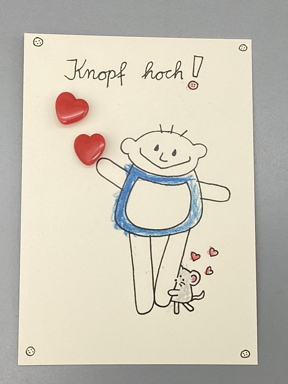 Mutmachkarte Knopf hoch ! Zwei Knopf Herzen mit nini san Junge
