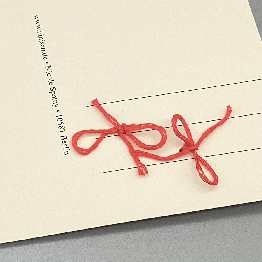 Die beiden knallroten Plastik Knöpfe werden von mit per Hand mit einem dazu passenden Stickgarn an die Karte geknotet ( siehe auch Bilder mit den beiden Knoten am Adressfeld auf der HInterseite der Mutmachkarte Knopf hoch )