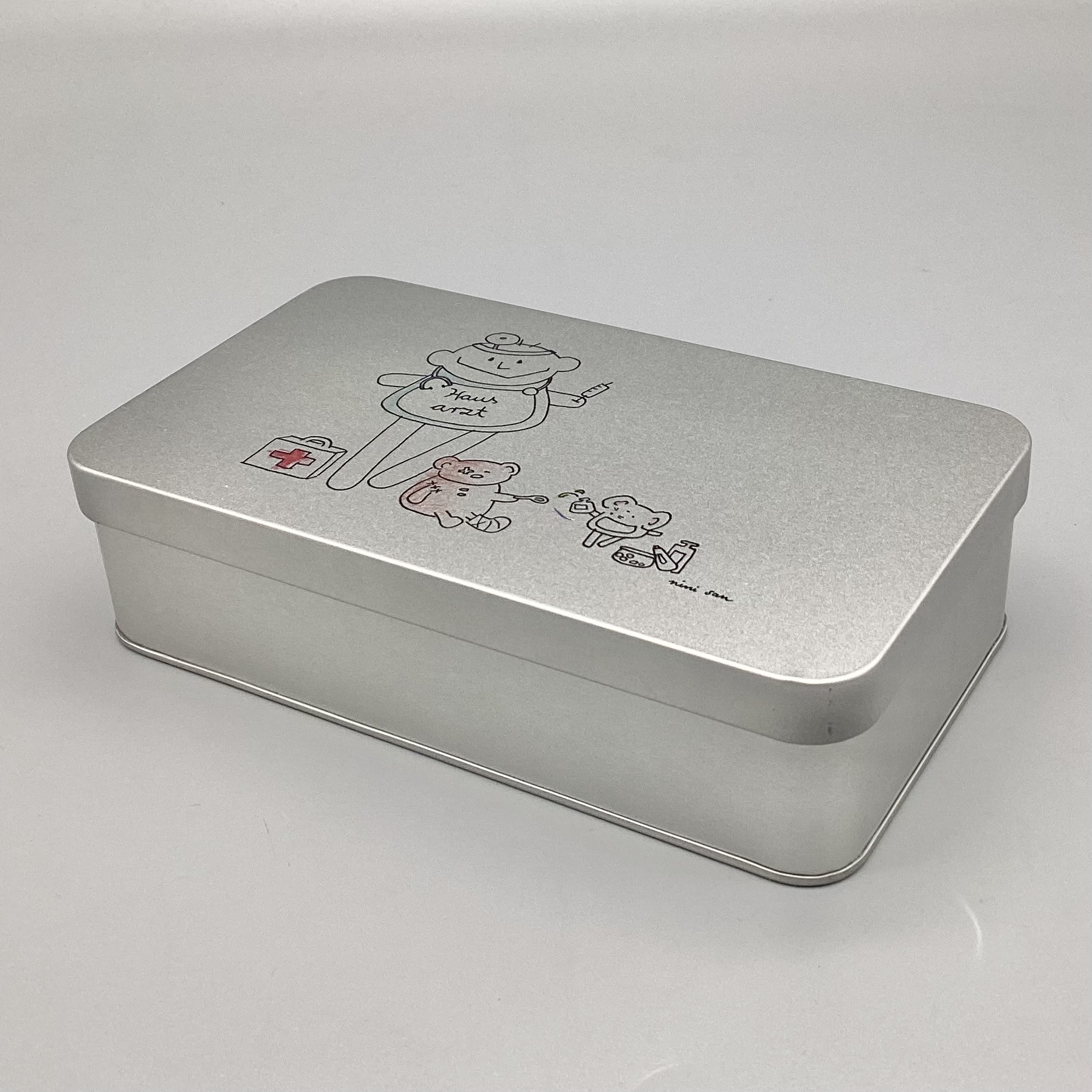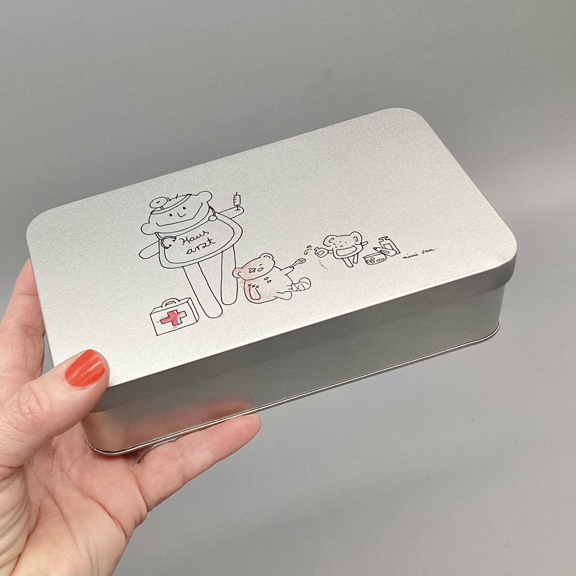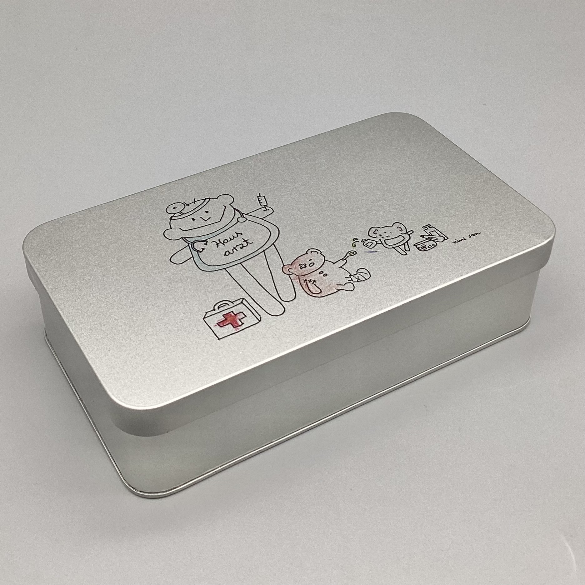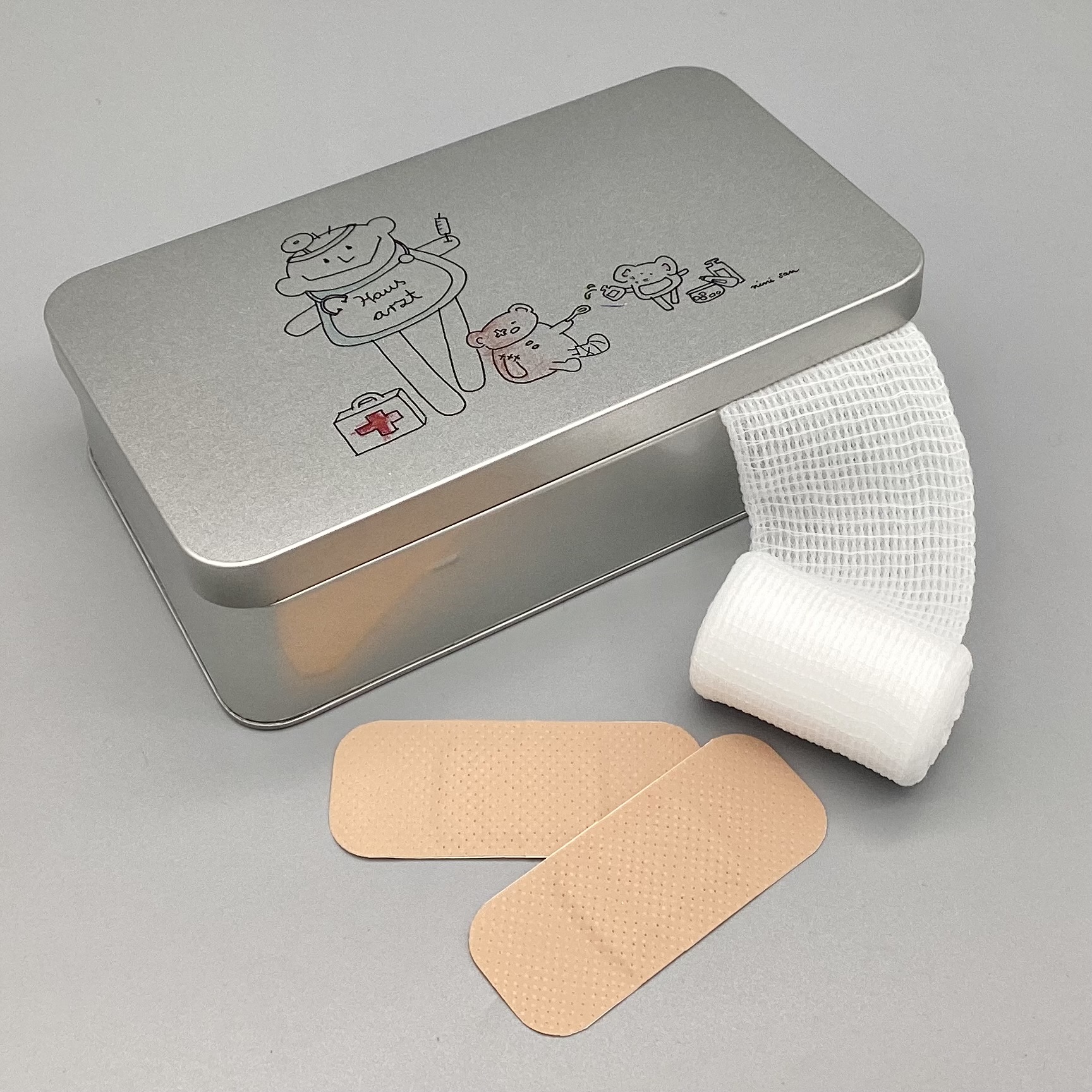 Metalldose mit nini san Illustration in grau-schwarz: männliche nini san Figur als Hausarzt mit Arztkoffer, Stethoskop und Spritze. Zu seinen Füssen steht ein Arztkoffer und ein brauner Bär sitzt mit Gipsbein und Pflaster am Auge am Boden. Eine Maus mit Medikamenten tröpfelt dem Bär eine Tinktur auf einen Löffel.