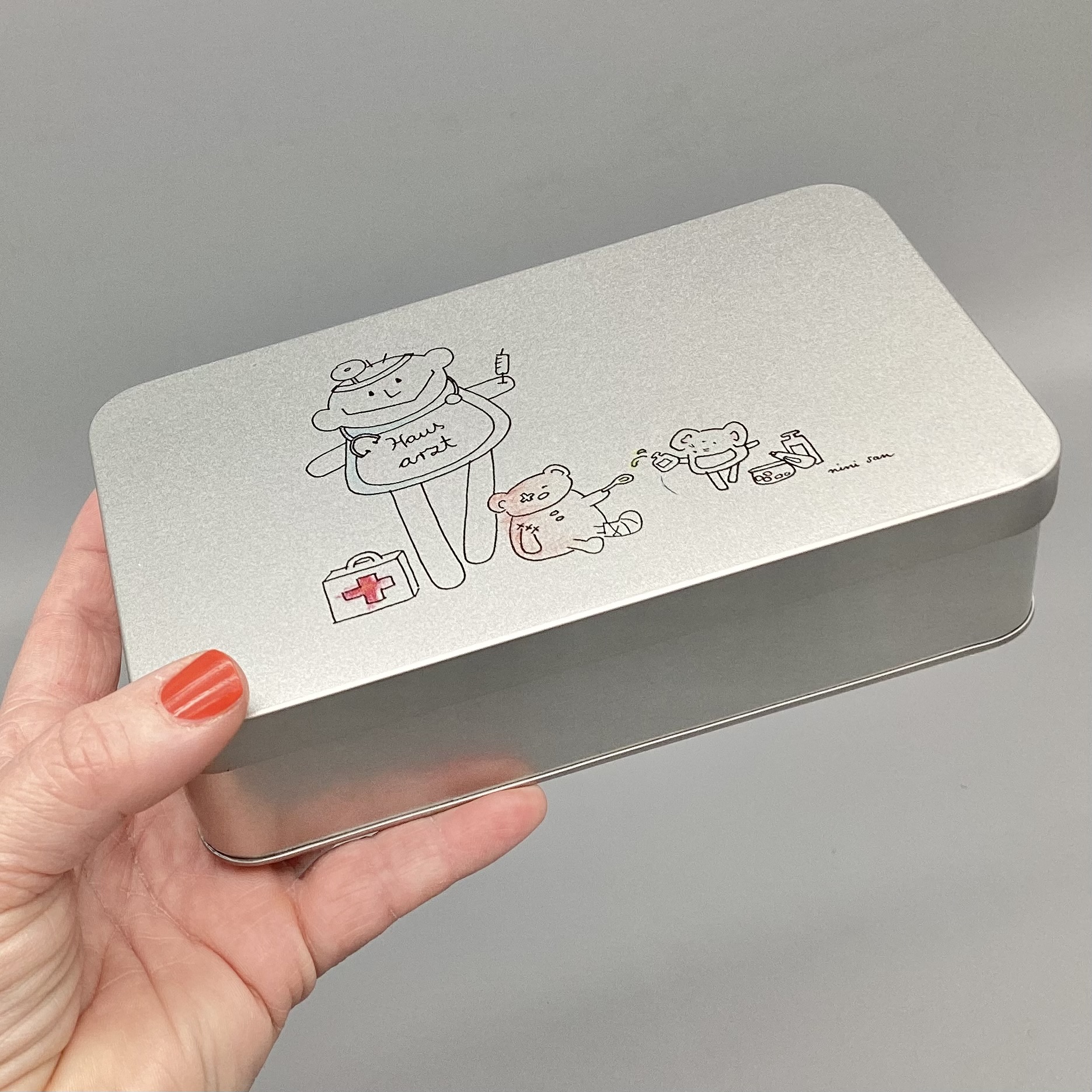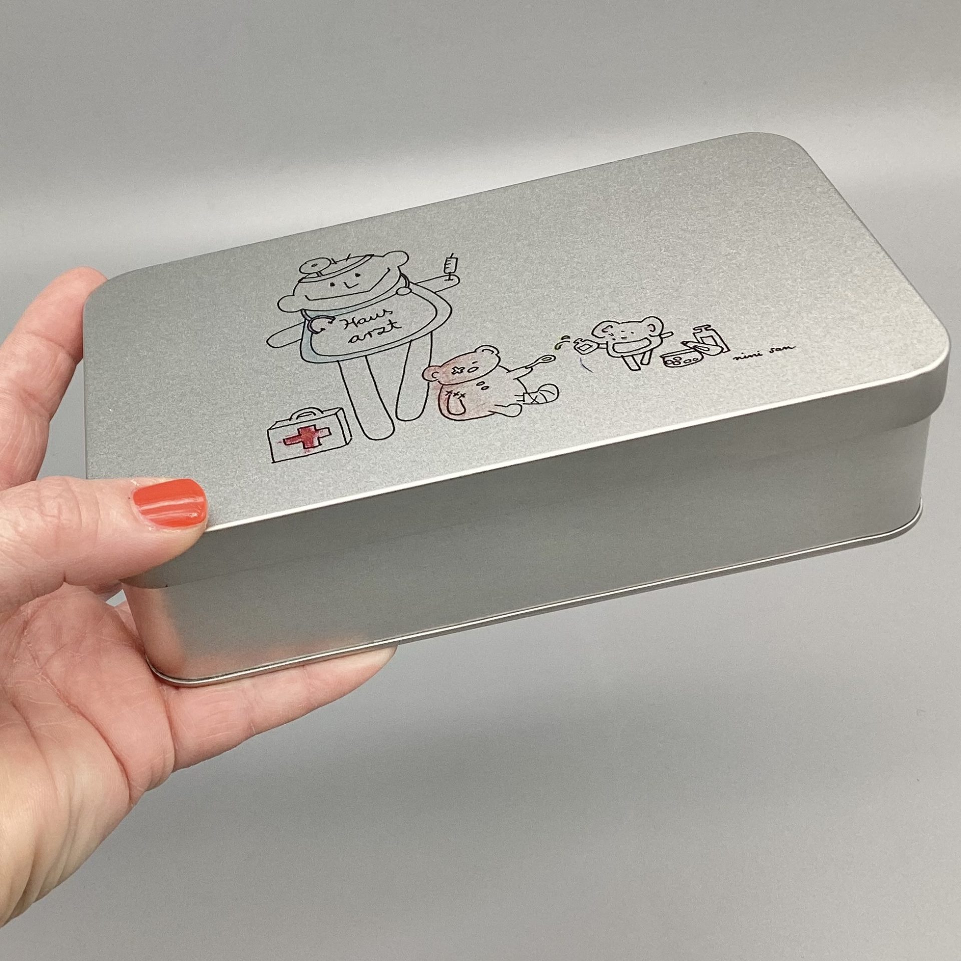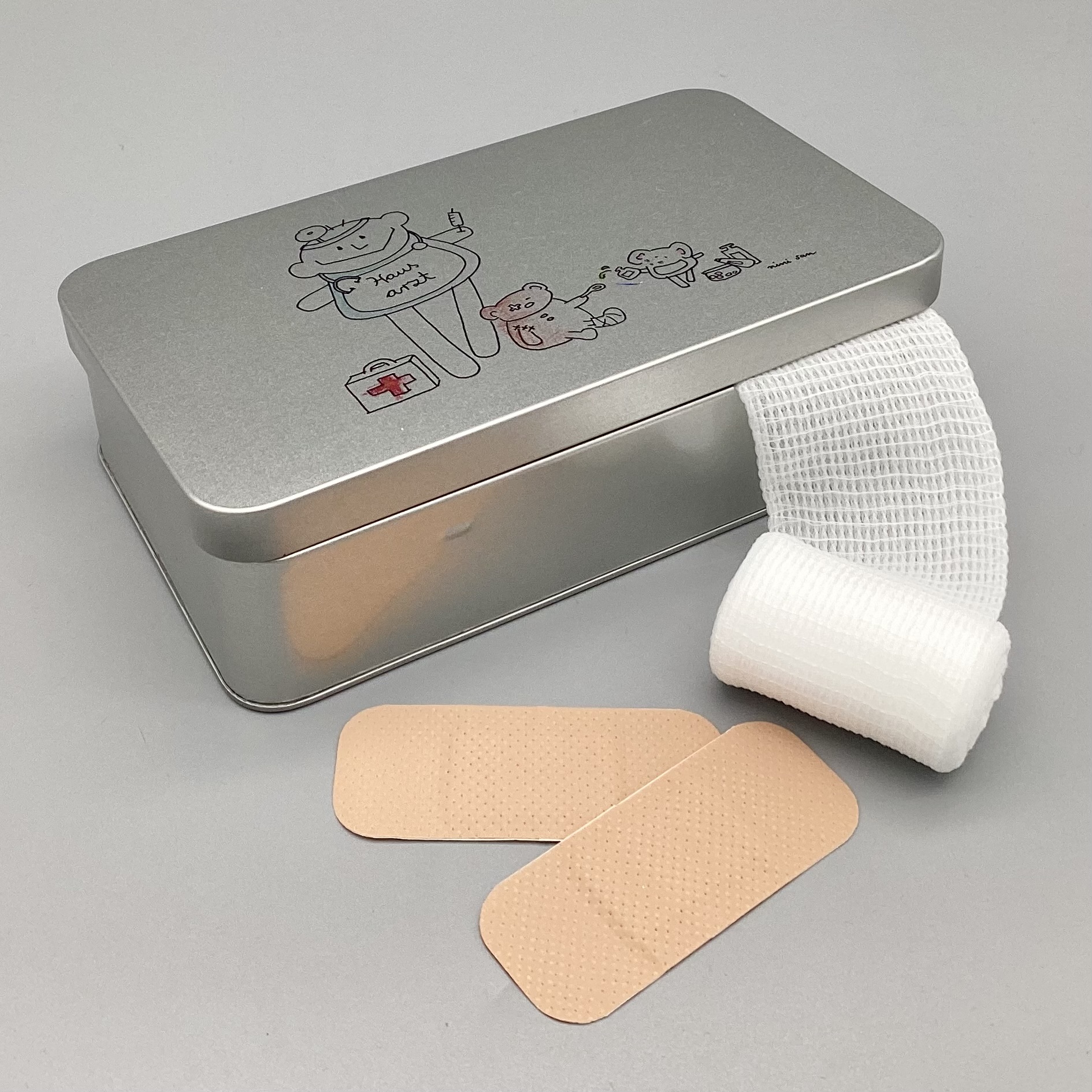 Metalldose mit nini san Illustration in grau-schwarz: männliche nini san Figur als Hausarzt mit Arztkoffer, Stethoskop und Spritze. Zu seinen Füssen steht ein Arztkoffer und ein brauner Bär sitzt mit Gipsbein und Pflaster am Auge am Boden. Eine Maus mit Medikamenten tröpfelt dem Bär eine Tinktur auf einen Löffel.