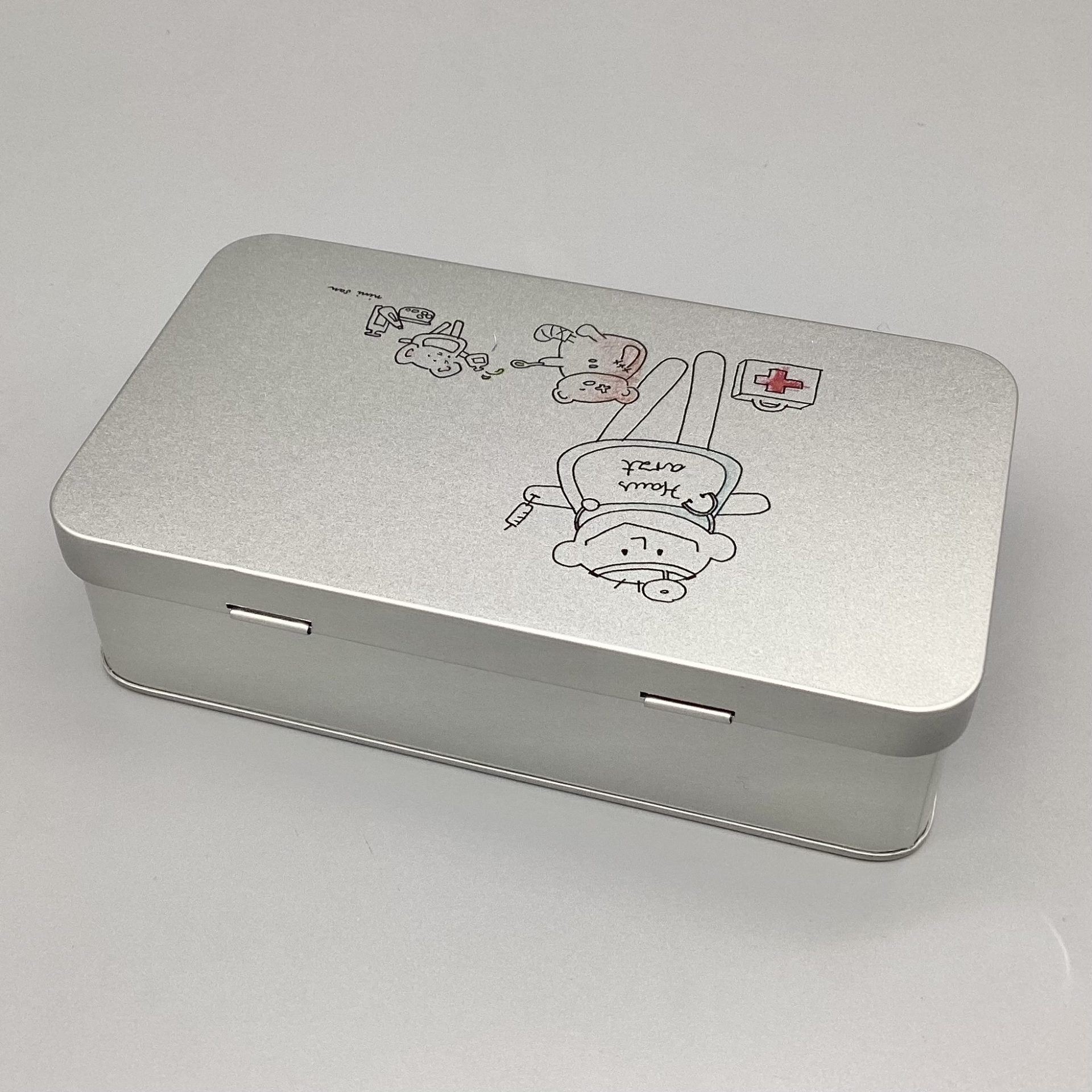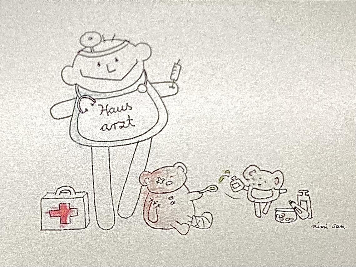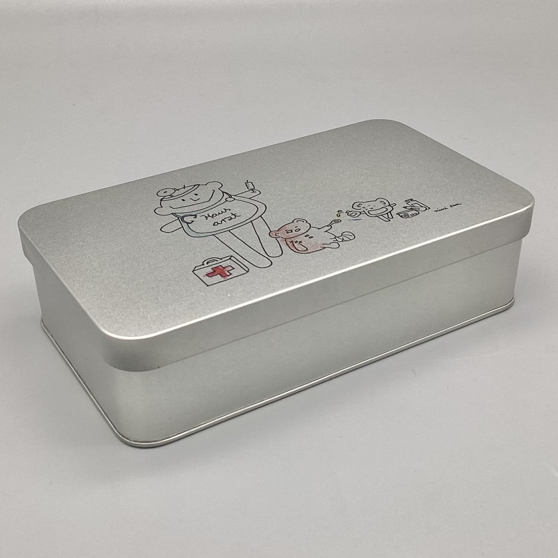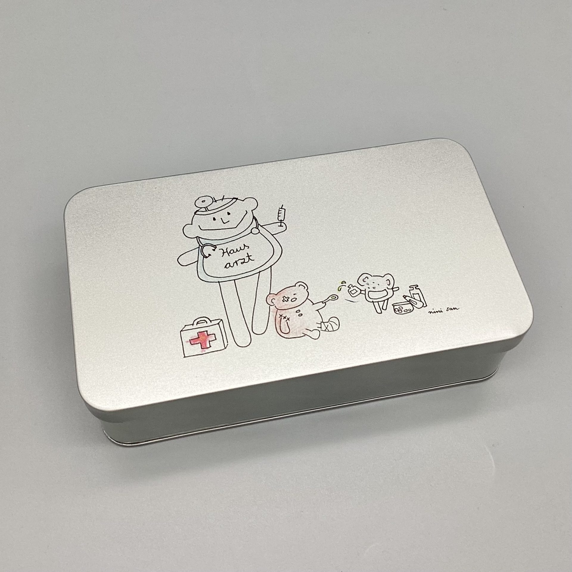 Metalldose mit nini san Illustration in grau-schwarz: männliche nini san Figur als Hausarzt mit Arztkoffer, Stethoskop und Spritze. Zu seinen Füssen steht ein Arztkoffer und ein brauner Bär sitzt mit Gipsbein und Pflaster am Auge am Boden. Eine Maus mit Medikamenten tröpfelt dem Bär eine Tinktur auf einen Löffel.
