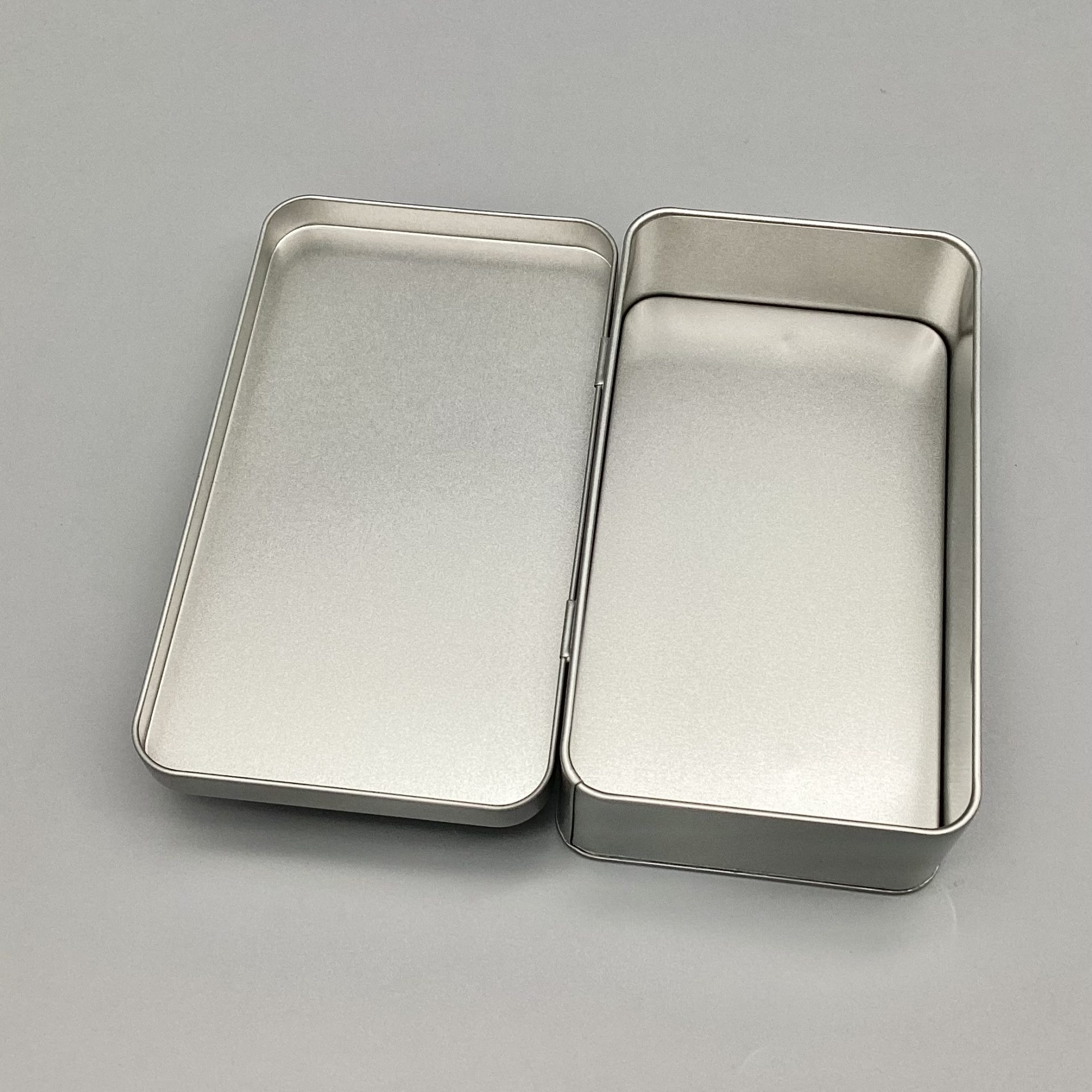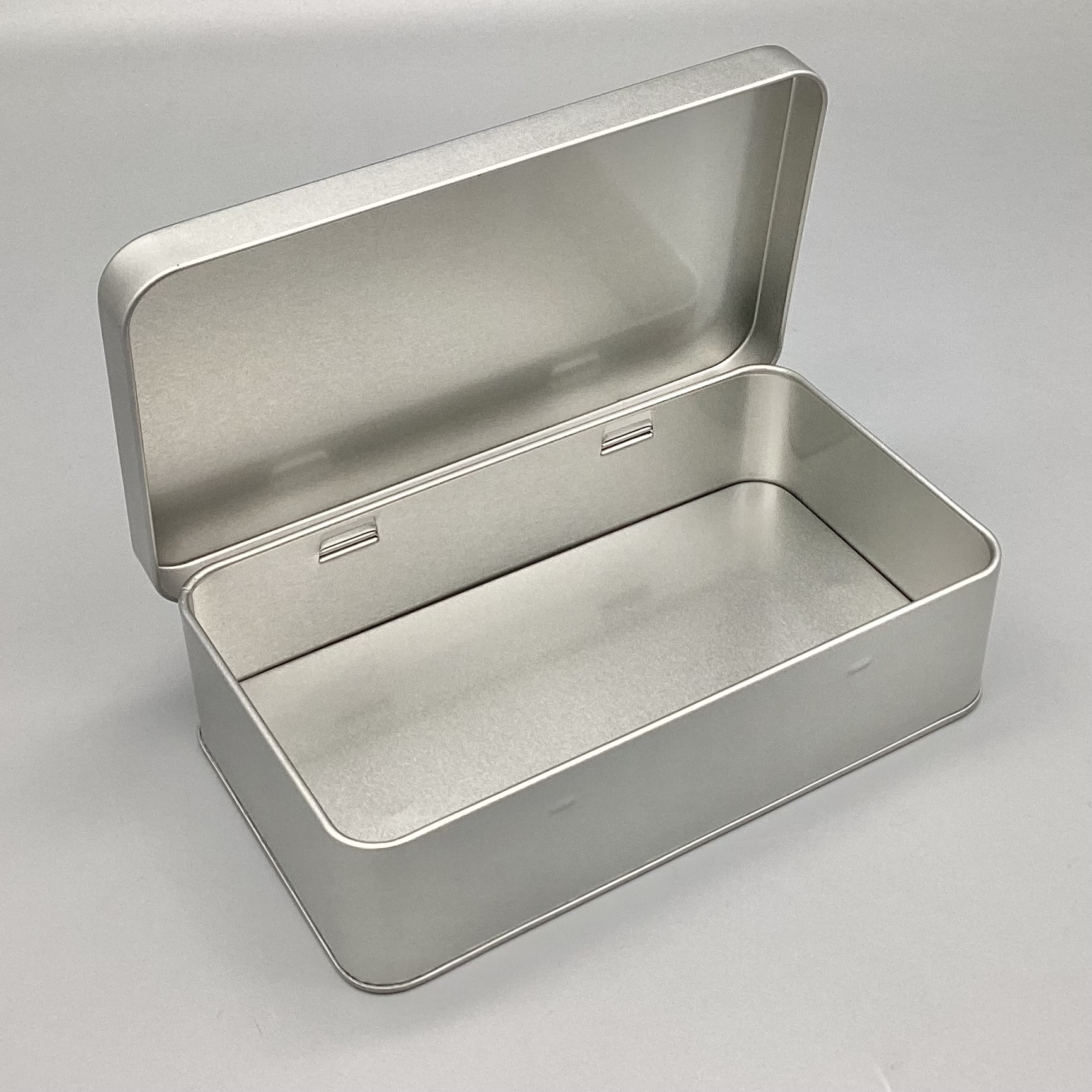 Kleine Rechteckdose aus Metall mit Scharnierdeckel.